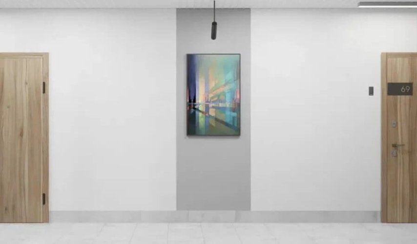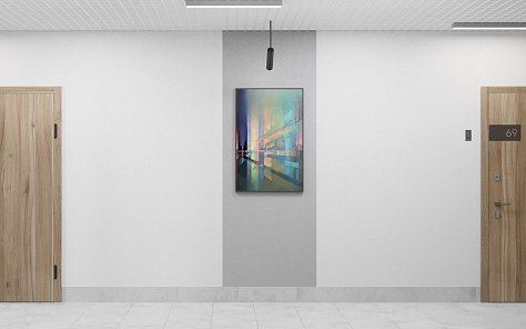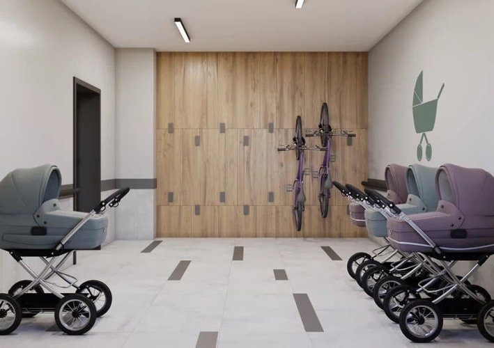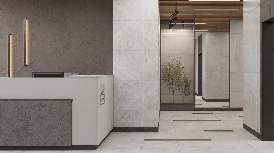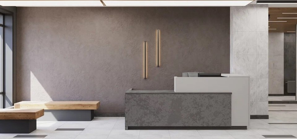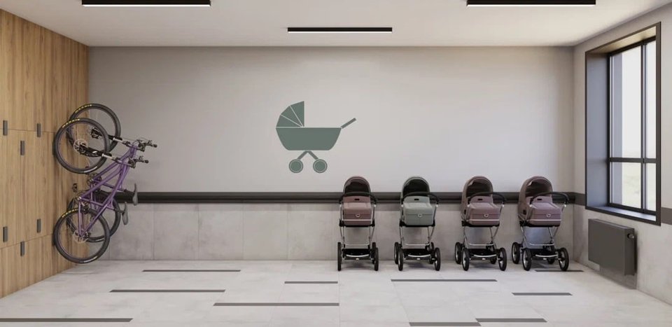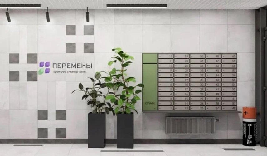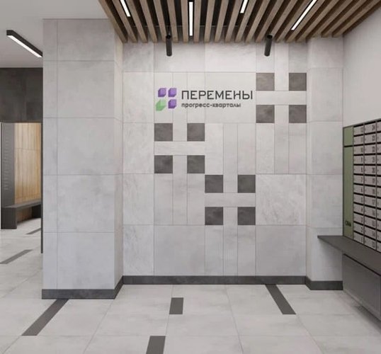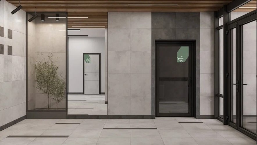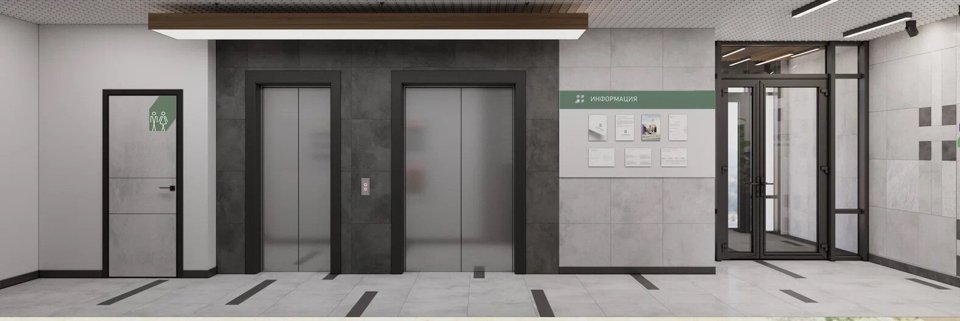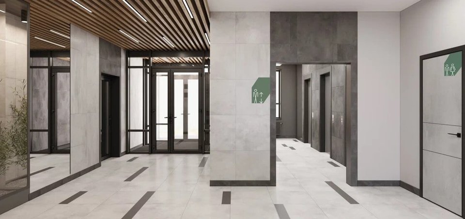 Вход в дом расположен на уровне земли, без ступенек. Холлы оформлены в современном урбанистическом стиле. На первом этаже предусмотрены места для хранения колясок и велосипедов, есть санузлы и места для отдыха. За порядком на этаже следит консьерж.