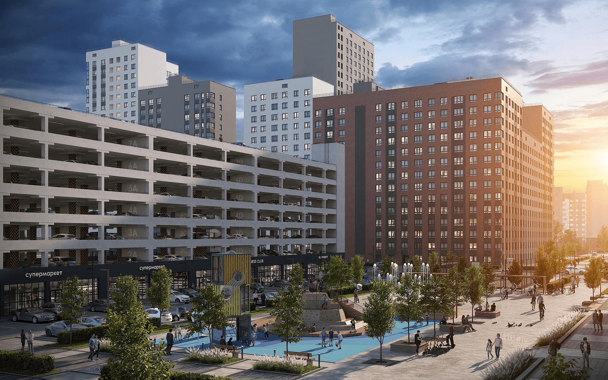 Наземные парковки расположены по периметру квартала так, чтобы внутренние улицы были свободны от машин. А для постоянного хранения автомобилей в «Переменах» будет крытый 7-уровневый паркинг.