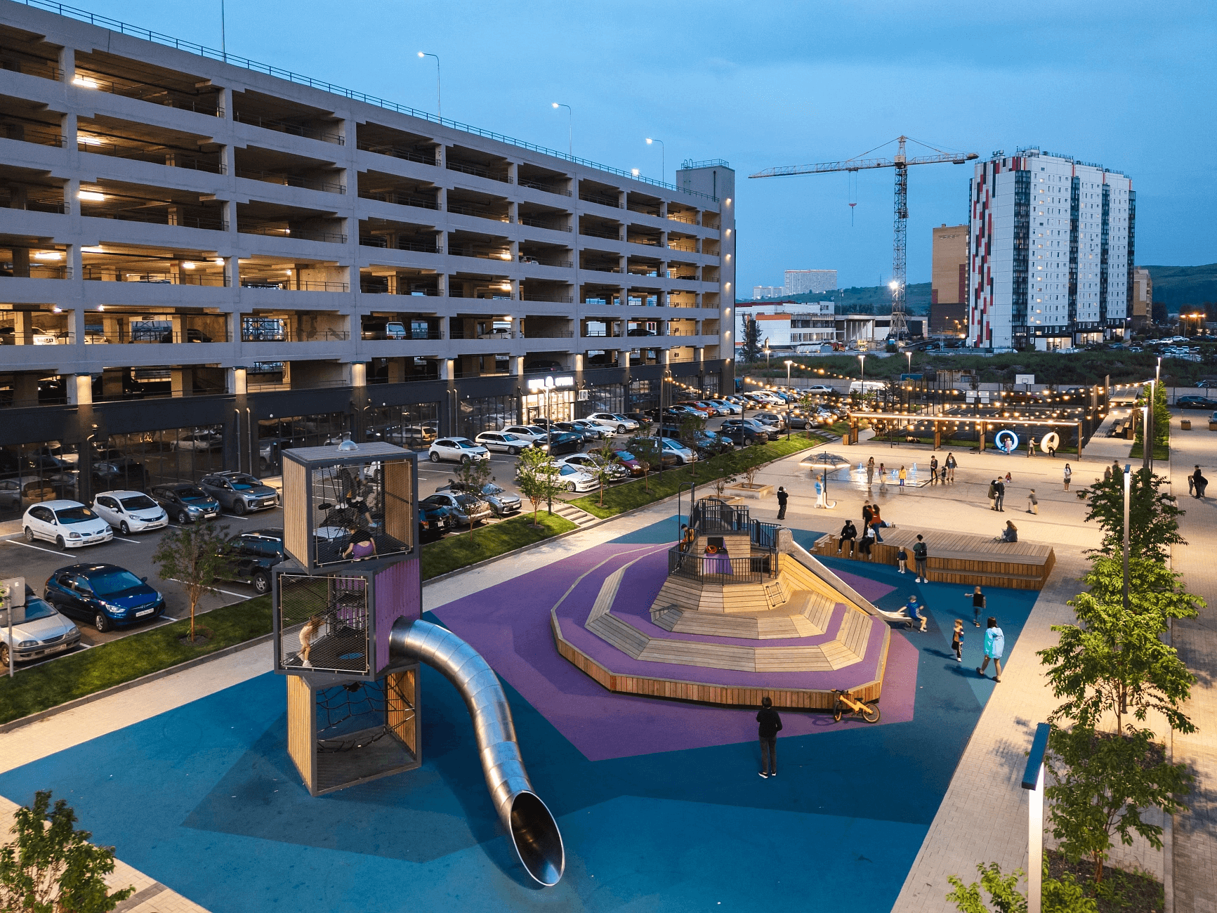 акватермальный комплекс. Мультиформатный двор. Игровые площадки на искусственных холмах, светящиеся качели, большая воркаут-зона с крытым