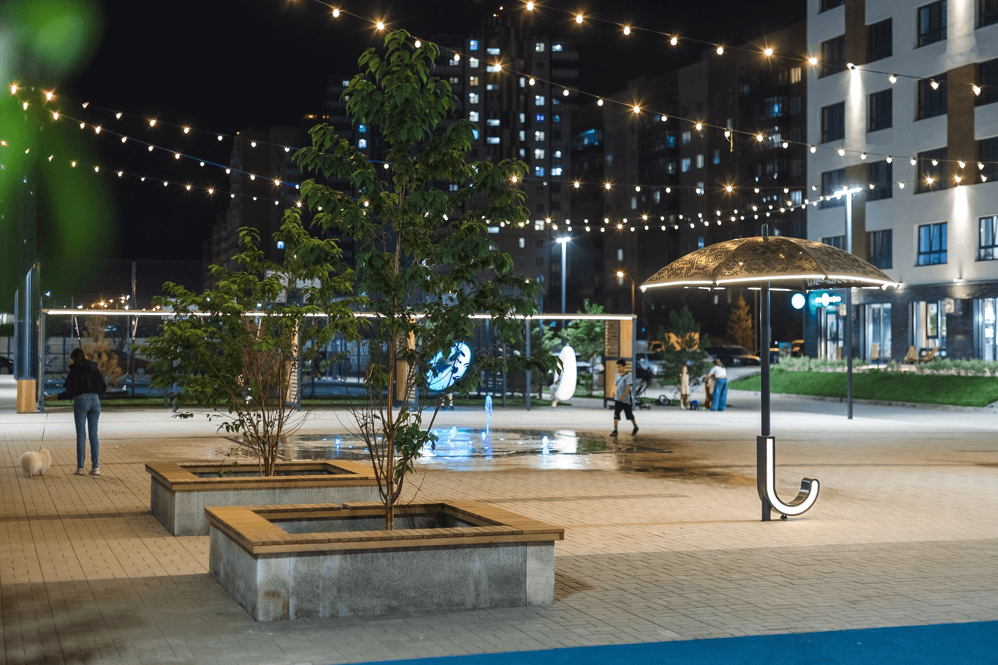 Игровые площадки на искусственных холмах, светящиеся качели, большая воркаут-зона и уличная мебель в тени деревьев