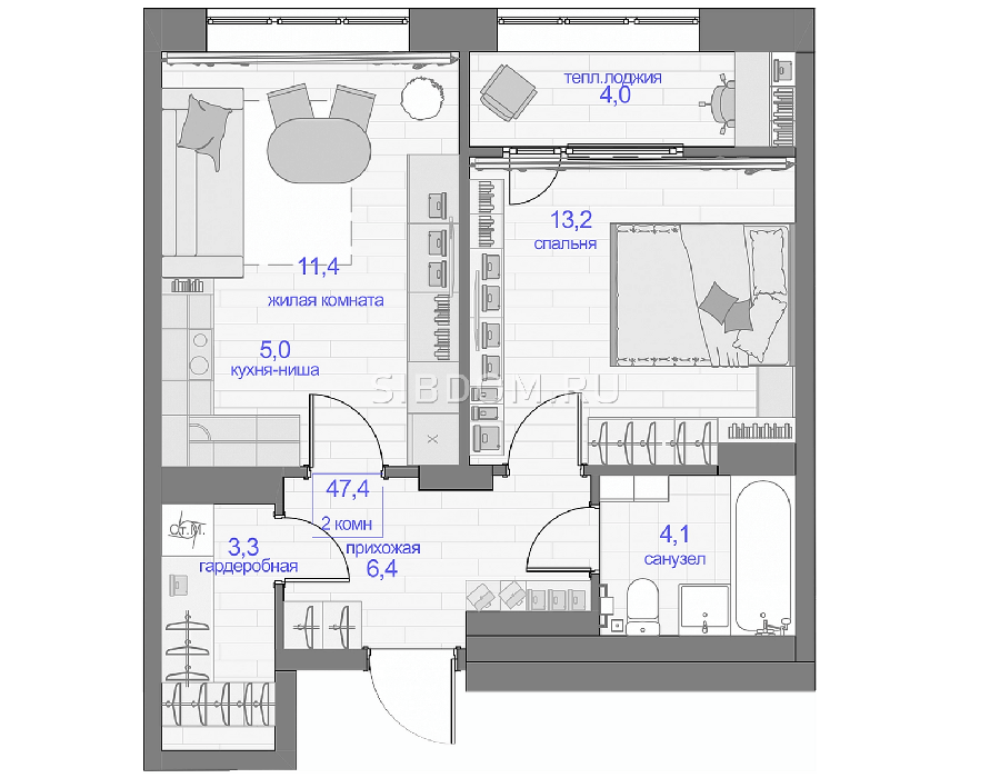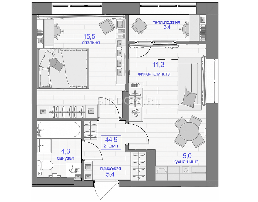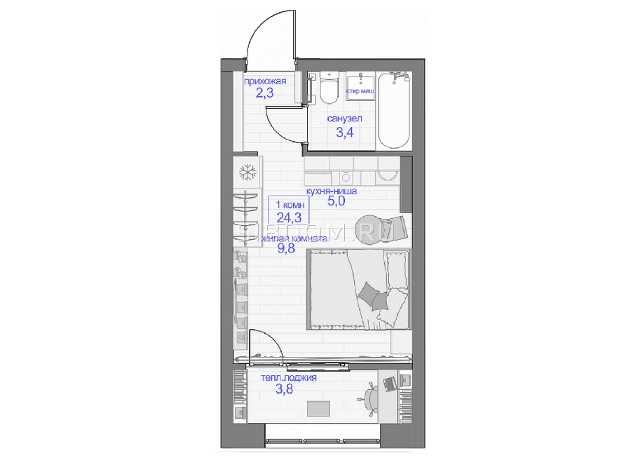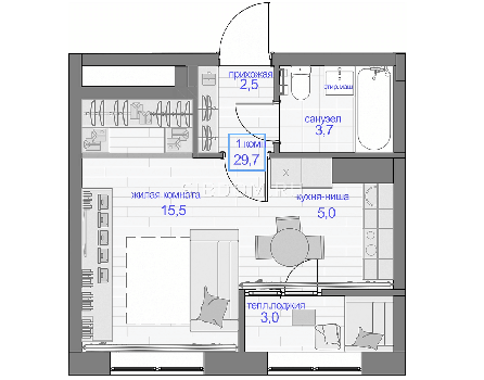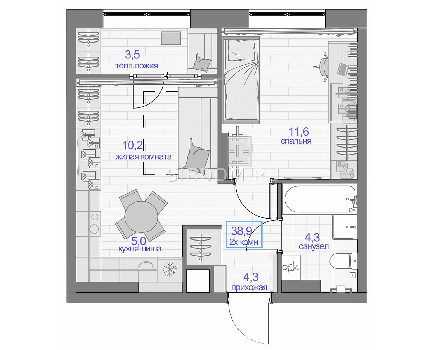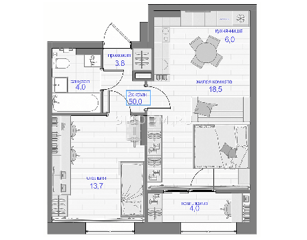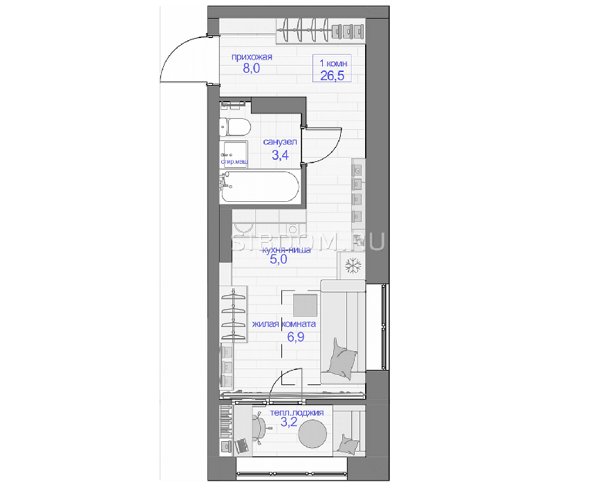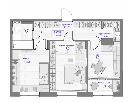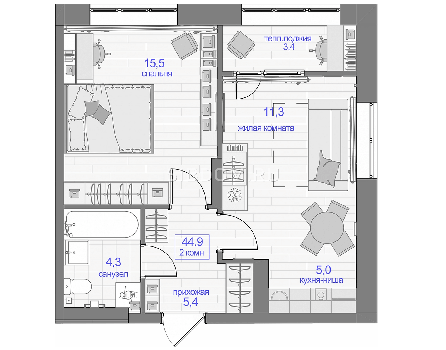 Готовая чистовая отделка, выполненная в нейтральных тонах, включает: