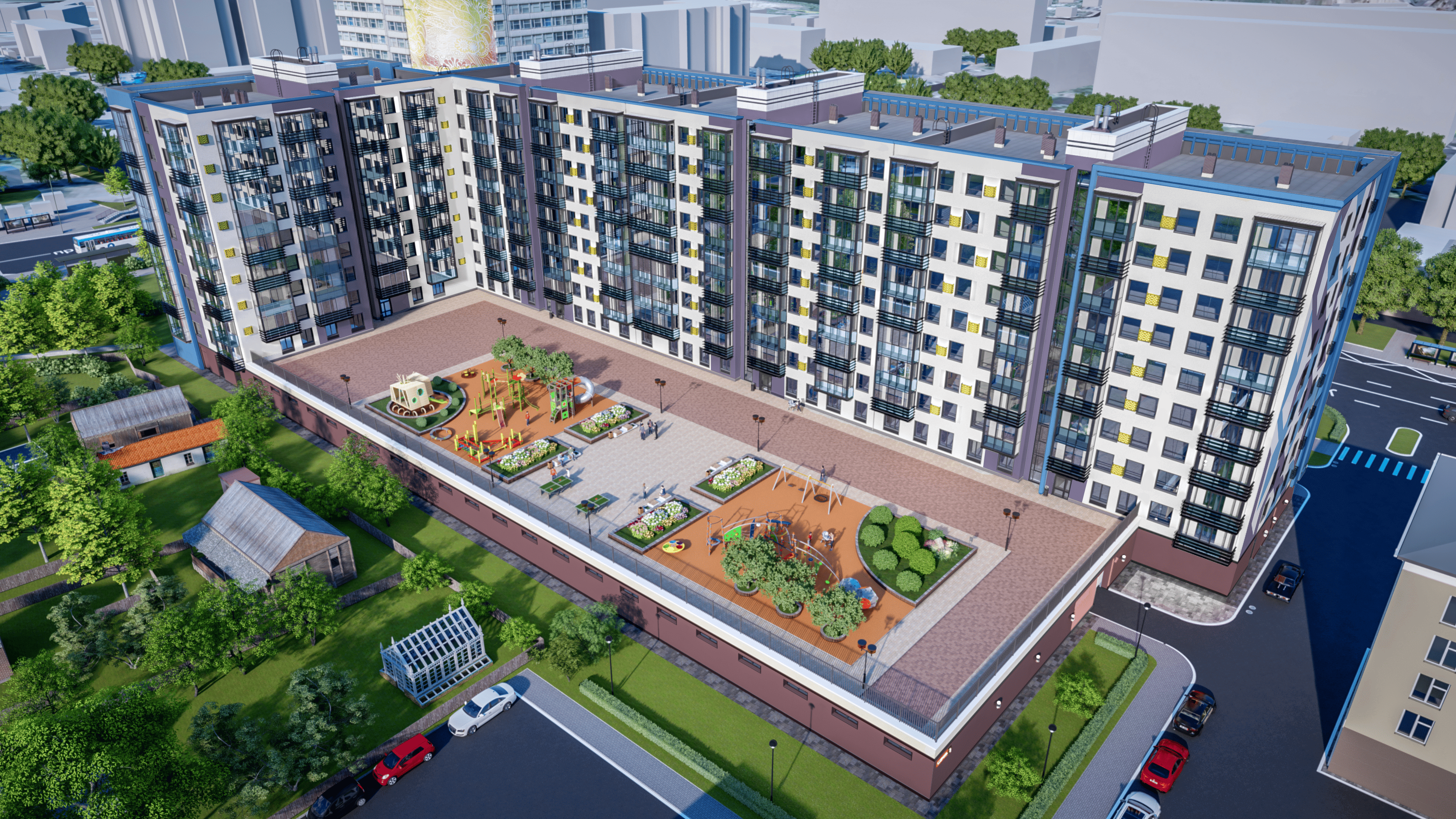 Жилой комплекс сформирован из четырех блок-секции, высота комплекса 10 этажей.