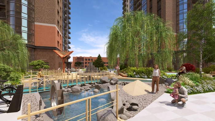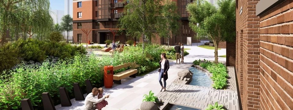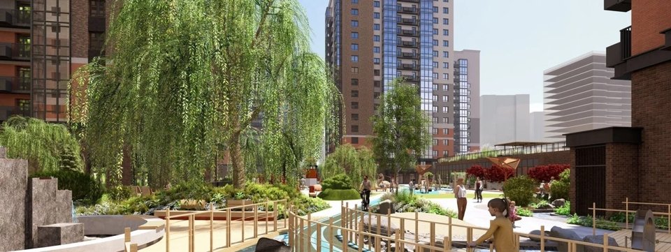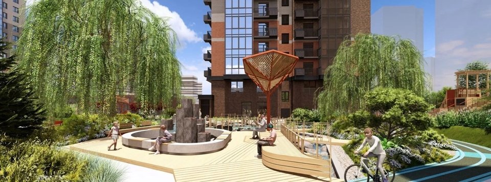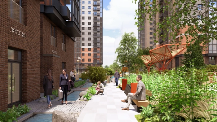 Все зеленое благоустройство во дворе подчиняется ритму текущей воды. Вокруг канала сформирована зеленая прогулочная зона, местами расширяющаяся в полноценные площадки для тихого отдыха. Зеленая полоса отделяет каждый жилой дом и красиво обрамляет речной берег, где-то формируя целые висячие сады, опускающиеся до самой водной поверхности, а где-то подчеркивая многоуровневым озеленением водный каскад (водопад).