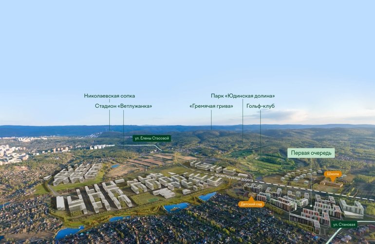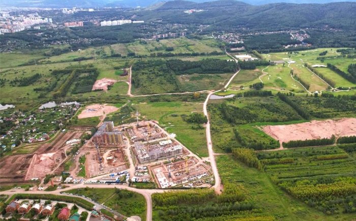 «Юдинский» возводится в западной части Красноярска, в окружении прудов, гольф-полей, плодовых деревьев и эко-парков.