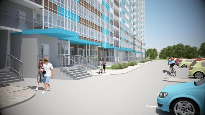 Закрытые от автомобилей внутренние дворы. Входы в подъезды домов выполнены на уровне отметки благоустройства.