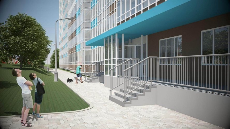 Все первые этажи домов – нежилые. Входа в помещения выполнены на уровне отметки благоустройства. Помещения домов первой линии (в доме №1 это секции №1-№3) имеют входа с обеих сторон дома. Выполняется витринное остекление в помещениях от уровня пола.