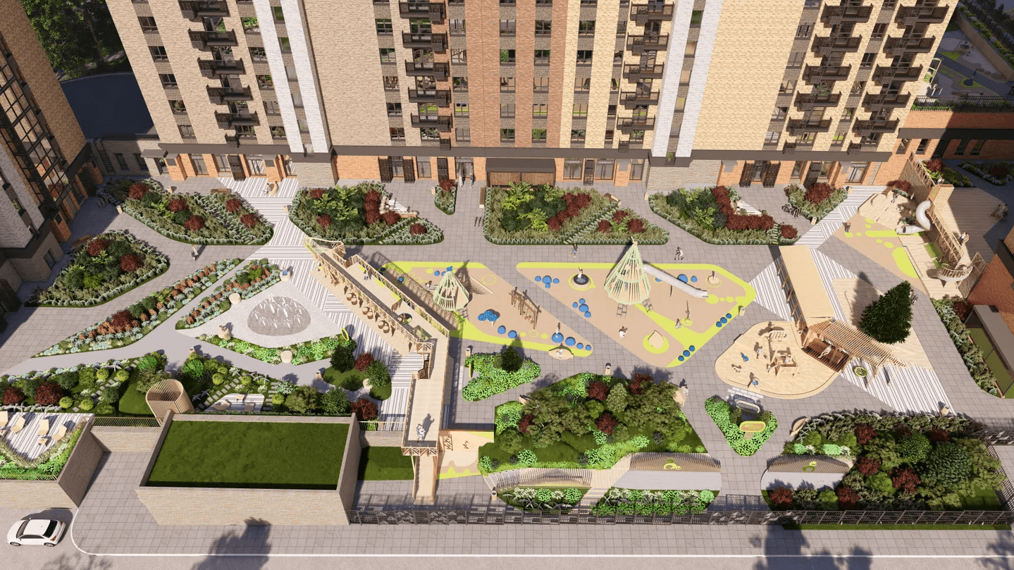 Ваш двор абсолютно свободен от машин – для этого предусмотрен подземный паркинг на 320 машино-мест с доступом на лифте и 54 парковочных места по периметру мини-района